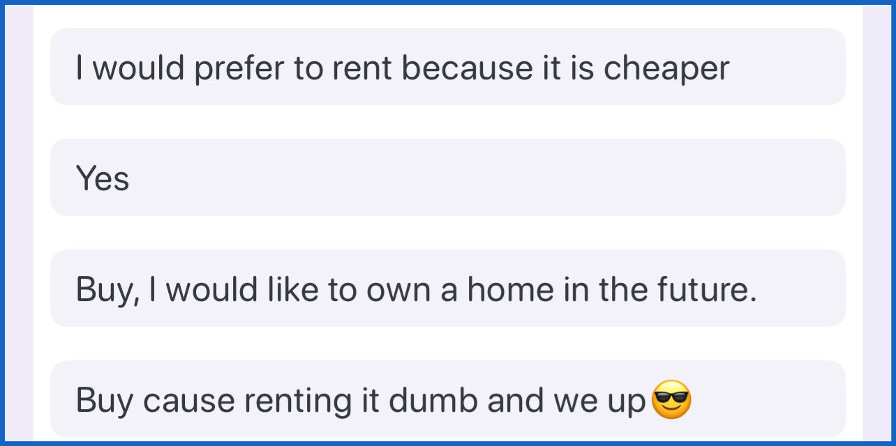 By thinking critically about my mother’s perspective, I realized that it deviated from the typical representation characterizing the experience in the typical TikTok videos, where homeownership is fundamentally an experiential feel. My mother views the experience differently, where she sees the commitment in terms of a recurring payment associated with homeownership. The important thing to take note of in my mother’s perspective is that she has the tendency to discourage potential buyers if the financial experience doesn’t make sense.